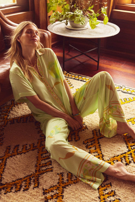 Ein frisches und elegantes Set mit zartem Blumenmuster. Das kurzärmelige Hemd mit klassischem Kragen passt perfekt zu den weiten Hosen mit elastischem Bund und verstellbarem Kordelzug – ideal für einen stilvollen, entspannten Urlaubslook. Der Stoff ist leicht, glatt und angenehm auf der Haut – perfekt für warme Tage.