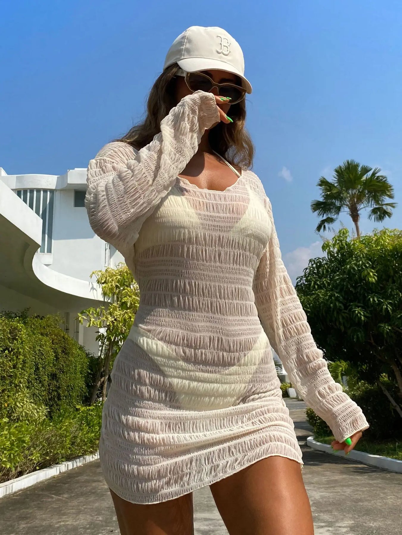 Lightweight, luminous, and made to turn heads — Halo is the swim set that transforms every moment into your runway. This three-piece showstopper includes a minimalist thong bikini, a sultry long-sleeve knit cover-up dress, and bold backless detailing that demands attention without saying a word.
